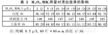 高的白度并合理利用漂白劑, H2O2/HK用量以10/10~15/15g/L比較適宜。