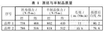采用冷軋堆練漂工藝,基本解決了彈力斜紋織物加工中易卷邊、折皺的缺點(diǎn),半制品降強(qiáng)少,白度、毛效符合后道染色工序要求(表1)。