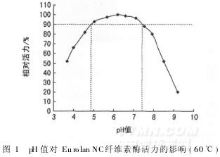 2.1 pH值對纖維素酶EurolanNC活力的影響溫度60℃條件下,測試pH值對纖維素酶EurolanNC活力的影響,結(jié)果見圖1。