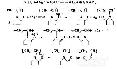 Z.Zhang[1]等用肼作為還原劑,PVP作為保護劑,制備鈉米銀。PVP提供的孤對電子還原銀離子,并防止銀被氧化,該反應(yīng)在堿性條件下進行: