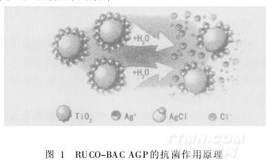 德國Rudolf公司開發(fā)了納米二氧化鈦類型的納米銀抗菌劑RUCO-BACAGP。納米二氧化鈦是有效組分氯化銀的載體,在濕狀態(tài)下(如排汗),釋放出具有抗菌效果的銀離子(自我反饋),如圖1所示。由于RU-CO-BACAGP有很大的表面活性,1g納米級的RUCO-