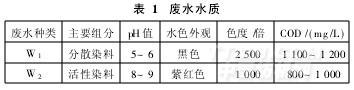 試驗(yàn)用廢水為南通某印染廠產(chǎn)生的兩類不同性質(zhì)的生產(chǎn)廢水W1和W2,其水質(zhì)指標(biāo)見表1。