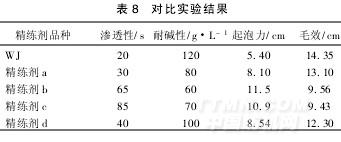 (1)精練劑WJ具有良好的滲透性、耐堿性,以及良好的乳化分散性和凈洗性能。用其配制的溶液穩(wěn)定,不漂油,不凝聚,不分層,且泡沫較低。有利于節(jié)約能源,降低成本。