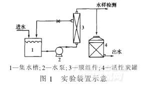 活性炭罐體積為25L,直徑0.25m,高0.4m;膜組件為天津膜天膜公司生產(chǎn)的MOF-503型產(chǎn)品,純水通量2m3/d;水泵為市售蠕動(dòng)泵,集水槽為25L塑料水桶。