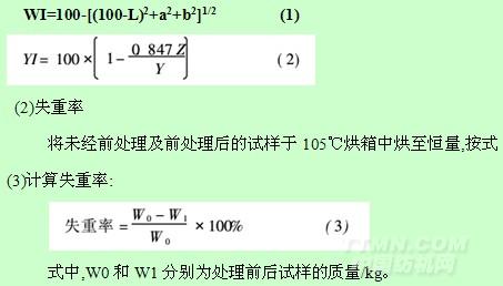 試樣的三刺激值(XYZ),Lab值(Hunter表色體系)和彩度C在Color-Eye7000A測(cè)色儀上測(cè)定,采用D65光源和10°觀察角。亨特白度(WI)按式(1)計(jì)算,黃度(YI)按ASTME313-73計(jì)算[式(2)]: