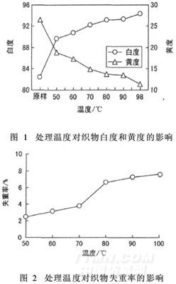 改性茶皂素40g/L,處理時(shí)間40min,按1.2.1節(jié)工藝,改變溫度處理棉織物,考察處理溫度對(duì)織物白度、黃度和失重率的影響,結(jié)果見(jiàn)圖1和圖2。