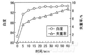 圖3 處理時(shí)間對(duì)織物白度和失重率的影響
