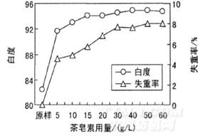 改變改性茶皂素用量,按1.2.1節(jié)工藝于98℃對(duì)棉織物浸漬處理40min,測(cè)試處理后織物的白度和失重率,結(jié)果見(jiàn)圖4。