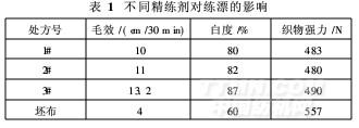 由表1可知,采用不同的精練漂白處方,可使莫代爾/棉混紡針織物獲得不同的練漂效果。其中采用3#處方的練漂效果最好,所以我們選擇以NF-1作為練漂助劑的3#處方進(jìn)行練漂。