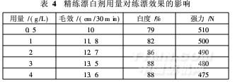 在95℃、40 min條件下,改變精練漂白劑NF-1用量,測(cè)試練漂效果,見(jiàn)表4。