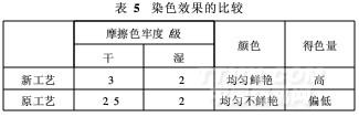 由表5知,用新工藝練漂的莫代爾/棉混紡針織物染色均勻、顏色鮮艷、得色量高,色牢度達到客戶的要求,解決了原工藝染色不鮮艷、得色量低的問題。