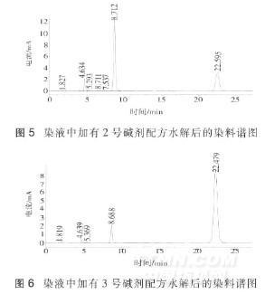 從圖 2~圖 6 可以看出在同樣用量、同樣條件下水解相同時(shí)間, 用固色堿 L5010 的體系染料水解最少。原因是固色堿 L5010 具有十分強(qiáng)的 pH 緩沖能力, 可將染液的 pH 值維持在一個(gè)穩(wěn)定適宜的水平, 既可提供足夠的堿性促進(jìn)染料固色, 又可以減少染料因堿性過強(qiáng)而發(fā)生的水解反應(yīng)。