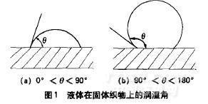 Γ1一定時,Γs越小,θ越大,液體越難潤濕固體表面。因而在織物表面整理低表面張力的物質(zhì)后,可提高織物的拒水拒油性。根據(jù)牲<0.42Γ1估計,當固體表面張力小于30mJ/m2,時固體就具有較強拒水作用.當ys小于15mj/m2耐時具有較強拒油作用。