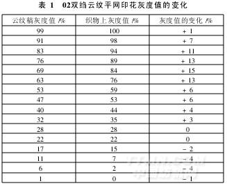 從表1可見,灰度過渡層次范圍在15%~76%的云紋稿,經(jīng)云紋平網(wǎng)印花后能較好地重現(xiàn)。灰度值大于76%,由于點子密度高,印制時色漿相互擠壓滲透,原有的層次部分被損失。經(jīng)多次試驗發(fā)現(xiàn),76%以上的灰度值都相當(dāng)接近。因此,在處理高灰度值的色點時,可適當(dāng)降低灰度值,一般控制在80%~85%。而當(dāng)云紋灰度值小于15%,由于點子密度疏,有很多孤立的細(xì)點,特別是灰度值為1%~6%時,織物上幾乎沒有層次感。因此,要將這部分的灰度值提高3%~5%。