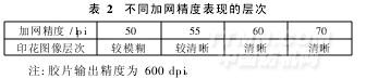 版花型達(dá)到穩(wěn)定的牢度,云紋稿子加網(wǎng)的目數(shù)必須與篩網(wǎng)的目數(shù)成一定的配比關(guān)系。經(jīng)資料和試驗(yàn)證明,篩網(wǎng)目數(shù)為云紋加網(wǎng)目數(shù)的4~5倍時(shí)較合適,所以加網(wǎng)精度在60~70lpi。表2是不同加網(wǎng)精度所表現(xiàn)的層次。