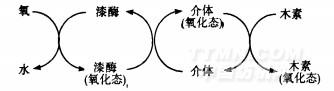 漆酶能夠在分子氧條件下催化很多酚型和芳香胺型化合物的氧化反應.[6]66酌通過加入小分子介體物質如ABTS[2,2-連氮-雙(3-乙基苯并噻唑-6-磺酸)]或HBT(1-羥基苯并三唑)可以將底物范圍擴大到非酚型木素結構單元.目前,漆酶/介體系統(tǒng)(LMS)已成功應用于木漿的漂白.[17]介體在酶的作用下會形成活性高且有一定穩(wěn)定性的中間體,中間體能夠從氧分子中獲得電子傳遞給木素分子使木素降解,脫除木素,達到漂白目的.其簡單的催化循環(huán)過程如下: