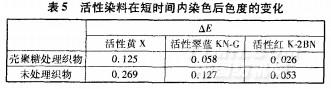 在最佳處理?xiàng)l件下對(duì)棉織物進(jìn)行殼聚糖浸漬處理,然后用三種不同類型的活性染料進(jìn)行染色,通過(guò)測(cè)定△E值,比較勻染性,結(jié)果見表5。