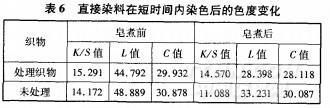 先在最佳處理?xiàng)l件下對(duì)棉織物進(jìn)行殼聚糖處理,然后用直接4BL藍(lán)染料縮短染色時(shí)間進(jìn)行染色,并進(jìn)行性能測(cè)試,結(jié)果見表6。