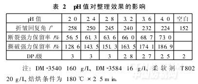 由表2知,DM-3540的抗皺整理效果對工作液的pH值有一定的依賴性。隨著工作液pH值的提高,折皺回復角呈下降趨勢,而強力不斷提高。當pH值較低時,雖然能獲得較高的折皺回復角,但強力下降較大;而在pH值較高的情況下,雖然強力保留率高,但免燙效果不能令人滿意。