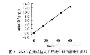 鋅基納米純棉織物的鋅溶出性包括溶出速率和大小兩個方面.鋅的溶出性應與織物上氧化鋅納米粒子的逸出性相一致.故可以此作為評價納米織物耐久性及其安全性的依據(jù)和方法.鋅基納米純棉織物在不同汗液中溶出性差異可由氧化鋅的化學性質(zhì)及同離子效應來解釋.ZnO是兩性氧化物,對酸堿都比較敏感.在酸性介質(zhì)中會發(fā)生如下反應: