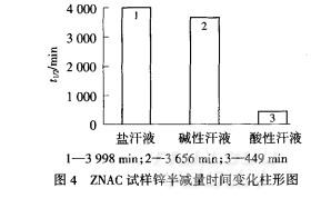 由圖4可以看出,同一試樣在不同汗液中的t1/2差異性很大:鹽汗液(pH≈8)>堿性汗液(pH≈8)>>酸性汗液(pH≈3).鋅基納米純棉織物耐酸性較差,tl/2不足450min;但耐鹽性和耐堿性較強,t1/2超過3000min.