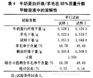 牛奶蛋白纖維/羊毛(50/50)在88%質(zhì)量分?jǐn)?shù)甲酸溶液中的溶解情況如表4所示。