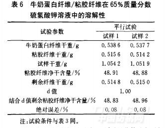 從表6可知,2個平行試樣的結(jié)果絕對差值小于l%,表明用65%質(zhì)量分數(shù)硫氫酸鉀溶液測定牛奶蛋白纖維/粘膠纖維中各組分含量測試結(jié)果具有很好的準確性。
