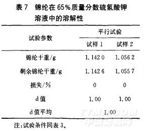 錦綸在65%質(zhì)量分數(shù)硫氫酸鉀溶液中的溶解情況如表7所示。