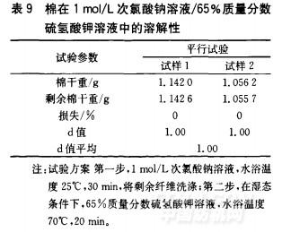 從表9可以看出棉在1mol/L次氯酸鈉溶液/65%質(zhì)量分?jǐn)?shù)硫氫酸鉀溶液中幾乎沒(méi)有損傷,修正系數(shù)為1.00。