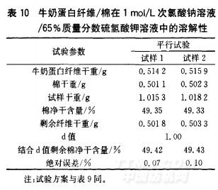 牛奶蛋白纖維/棉在lmol/L次氯酸鈉溶液/65%質(zhì)量分?jǐn)?shù)硫氫酸鉀溶液中的溶解情況如表10所示。