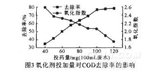 隨著氧化劑投加量的增加,COD去除率也迅速增加。但是同時氧化指數(shù)也不斷降低,單位計量的氧化劑氧化能力不斷降低。當(dāng)投藥量達(dá)到80mg/100mL廢水時,去除率達(dá)到63.5%,氧化指數(shù)2.18。繼續(xù)投加氧化劑,COD去除率增加減緩,而氧化指數(shù)迅速下降。因此確定氧化劑投加量為80mg/100mL廢水。