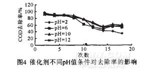圖4結(jié)果表明對于活性艷紅的催化氧化實驗,堿性條件下的處理效果都好于酸性條件下的處理效果?;钚云G紅分子在堿性條件下發(fā)生構(gòu)象變化,從而更易于ClO2的進(jìn)攻。酸性條件下COD去除率下降較堿性條件下快,表明酸性條件下催化劑載體上的活性組分流失較快,對催化氧化的效果也會產(chǎn)生不利影響。催化氧化活性艷紅的最佳pH值為10。