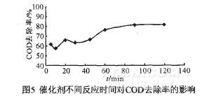 由圖5可以看出,隨著反應(yīng)時間的增加,COD的去處率逐漸增大,但是增加的幅度不是很大,反應(yīng)時間為90min時,去除率達(dá)到了80%以上,故確定反應(yīng)時間為90min。