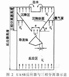 UASB反應(yīng)器由反應(yīng)區(qū)和沉降區(qū)兩部分組成。反應(yīng)區(qū)又可根據(jù)污泥的情況分為污泥懸浮層和污泥床區(qū)。污泥床主要由沉降性能良好的厭氧污泥組成,SS濃度可達(dá)50~100g/L或更高。污泥懸浮層主要靠反應(yīng)過(guò)程中產(chǎn)生的氣體的上升攪拌作用形成,污泥濃度較低,SS一般在5~40g/L。在反應(yīng)器上部設(shè)有氣、固、液三相分離器。