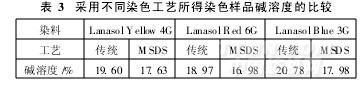 由表3可以看出,采用微懸浮體染色工藝可使羊毛纖維在染色過程中的受損程度顯著降低。這是因為微懸浮體染色工藝采用的是快速升溫,縮短了羊毛纖維在高溫階段的受熱時間。而傳統(tǒng)染色工藝必須采用慢速升溫,否則會引起染色不勻。受熱時間的不同導致了羊毛纖維受損傷程度的差異。