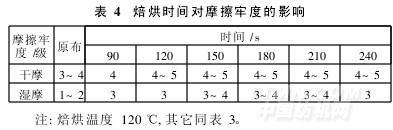 由表4可見(jiàn),焙烘90 s,干摩擦牢度就從3~4級(jí)提高到4級(jí),濕摩擦牢度從1~2級(jí)提高到3級(jí);焙烘150~210 s,干摩擦牢度提高到4~5級(jí),濕摩擦牢度提高到3~4級(jí);但是焙烘240 s,濕摩擦牢度稍微降低。