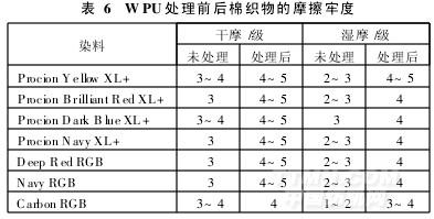 純棉白色斜紋機(jī)織布經(jīng)下列幾種活性染料染色后,再用WPU按上述的工藝條件進(jìn)行處理,測(cè)試處理后,織物的干、濕摩擦牢度如表6所示。