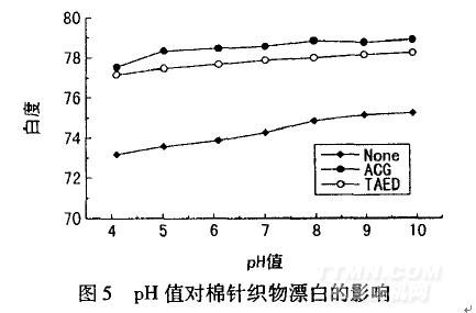 由圖5可知,在pH值4—10的范圍內(nèi),隨著pH值的升高,織物的白度逐漸提高,且在堿性條件下白度最高。這是因為對于雙氧7J~,/ACG活化體系,堿性條件更有利于乙酰胍陽離子的生成;對于雙氧7J~/TAED活化體系而言,在堿性條件下雙氧水分解產(chǎn)生的質(zhì)子被堿中和,從而加速了雙氧水分解反應的速率,有利于TAED與HOO一反應生成過乙酸。但是,pH值過高,雙氧水和乙酰胍陽離子存在穩(wěn)定性差的缺點。從多方面考慮,棉織物雙氧水/ACG活化體系漂白pH值可選取8左右。
