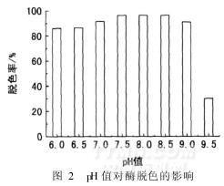 酶對(duì)酸堿度非常敏感,故使用時(shí)應(yīng)嚴(yán)格控制pH值。在50℃下,采用皂洗酶用量0. 25 g/L、調(diào)節(jié)劑AD用量1 g/L、處理15 min的工藝條件,考查不同pH值對(duì)酶脫色性能的影響,結(jié)果如圖2所示。