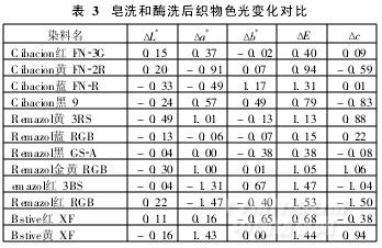 由表2知,對于大部分染料,酶洗和皂洗的干摩擦牢度相差不大;但對濕摩擦牢度,酶洗要比常規(guī)皂洗高0. 5~1級。常規(guī)皂洗是利用表面活性劑的螯合及分散作用,使織物上的浮色脫落,但仍有部分浮色會返沾到織物上。酶皂洗的機理則是破壞染料的發(fā)色團,從而達(dá)到使染料脫色的目的,浮色的去除更加充分。酶洗和常規(guī)皂洗后織物的水洗牢度差別不大。