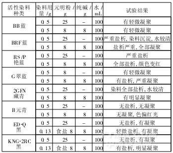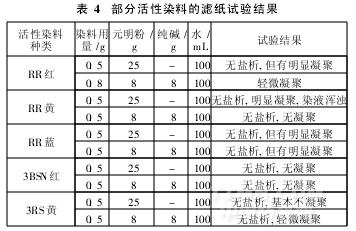 ②在副缸中采用大浴比化堿,與主缸形成循環(huán)。根據(jù)經(jīng)驗(yàn),染料的水解率分別是:二氯均三嗪類在40%左右;雙一氯均三嗪類近20%,個(gè)別超過30%;雙乙烯砜類、單乙烯砜類和異雙類(一氯均三嗪+乙烯砜)大部分在20%。部分活性染料在濾紙上的凝聚、鹽析、水解試驗(yàn)結(jié)果見表4。
