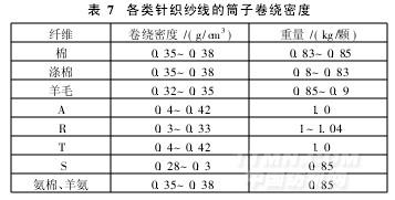 3.1 松筒是筒紗染色的第一道關(guān)鍵工序,約有50%的質(zhì)量問(wèn)題發(fā)生在該道工序,其中筒子卷繞密度是關(guān)鍵。如密度不勻、暗筋、露眼、松緊不勻、重量相同但大小不同等,都會(huì)造成色花、色差。因此,在松筒過(guò)程中要經(jīng)常巡回檢查、把關(guān)。各類針織紗線的筒子卷繞密度、重量見表7(家紡產(chǎn)品的密度、重量略有不同)。