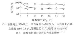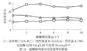 從圖10可以看出,硫酸鈉用量對皂洗效率有一定的影響,考慮到試驗誤差等因素,可以認(rèn)為皂洗過程中皂洗酶對低用量硫酸鈉不是很敏感.