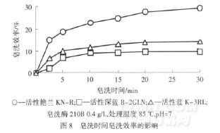 由圖8可知,隨著處理時間的延長,皂洗效率逐漸提高,20 min時,皂洗效率基本達(dá)到平衡.此時3只染料的皂洗效率:活性艷蘭KN-R>活性藍(lán)K-3RL>活性深藍(lán)B-2GLN.