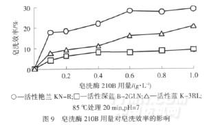 由圖9可知,活性深藍(lán)B-2GLN在較低的皂洗酶210B用量(0.4 g/L)下,皂洗效率基本達(dá)到了平衡.而活性藍(lán)K-3RL和活性艷蘭KN-R在皂洗酶210B用量分別為1.0 g/L、0.6 g/L時,才具有較高的皂洗效率.