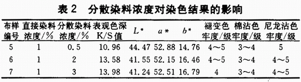 由表1可看出,分散染料濃度一定時,隨著直接染料濃度的增大,總的K/S值增大明顯,明度值L*降低,織物表面顏色加深,a*值和b*值變化不明顯,而退色牢度和棉布沾色牢度都有所降低,尼龍沾色牢度不變。這是因為直接染料上染棉纖維,其水洗牢度對織物整體的影響顯著。