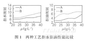 由圖2可知,隨著整理劑質(zhì)量濃度的增加,織物的拒水拒油效果增加,當(dāng)整理劑質(zhì)量濃度達(dá)到40g/L時(shí),拒水級(jí)均可達(dá)到最高級(jí)10級(jí)。這時(shí)有機(jī)氟整理劑在織物表面形成一層低張力的拒水拒油膜,整理劑質(zhì)量濃度越高,織物表面的有機(jī)氟含量越高,其分子堆積越緊密,從而拒水拒油效果增強(qiáng)。