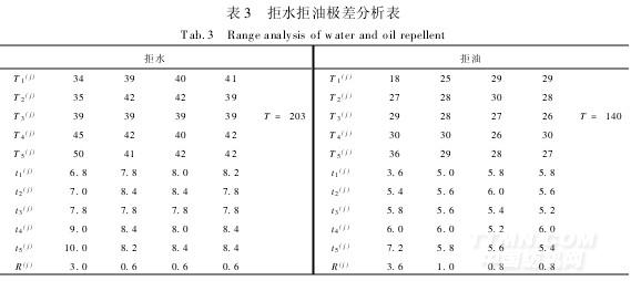 根據(jù)正交試驗(yàn)數(shù)據(jù),分別計(jì)算拒水拒油極差,結(jié)果如表3所示。