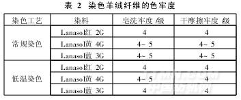兩種工藝的染色皂洗牢度和干摩擦牢度見表2。