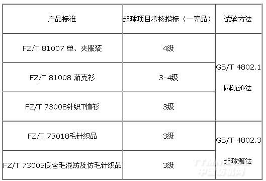 表7 產(chǎn)品標(biāo)準(zhǔn)起球項(xiàng)目的考核指標(biāo)及試驗(yàn)方法